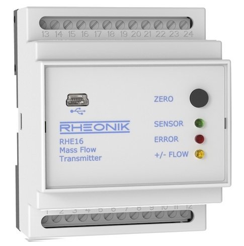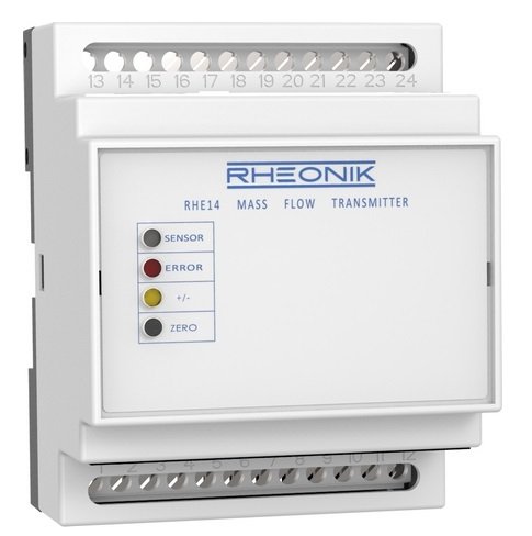 The RHEONIK mass flow meter consists of one of the RHM series flow sensors and one RHE series transmitter. The remote unit RHE 07/08 is for installation in a safe non-Ex area and is connected to the sensor via a single multi-conductor cable. Please note, that the types RHE 07/08 and all sensor articles are available in non Ex-versions (without Exnameplate). The RHE 11 (Ex d) may be installed and operated in hazardous Ex-areas (Zone 1 or 2). Ex-series sensors RHM (with Ex-Label) are, when connected with an Ex- Transmitter, made for installation inside hazardous areas (Ex-zone 0, 1 or 2). The transmitter RHE includes seven printed boards which can be replaced during servicing. The remote electronic unit consists of two bent measuring loops in the shape of an omega.